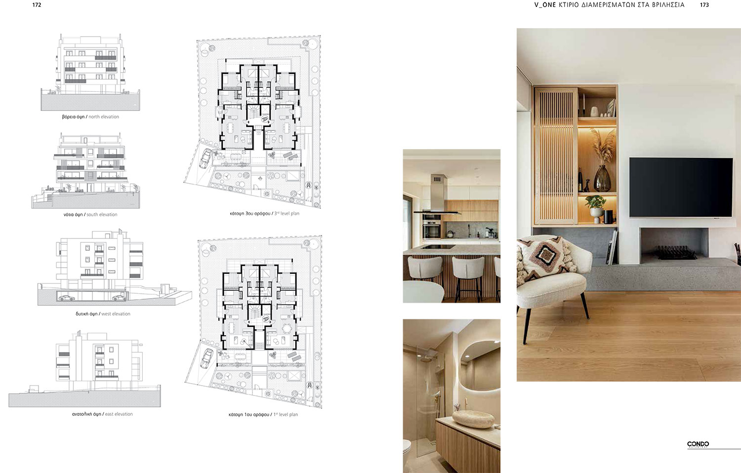 The project develops across three levels above the pilotis, each comprising two apartments of 120m2. A key design decision was to position the living spaces -living room and dining area- on the southeast side to take advantage of maximum natural light and optimal views of the city.