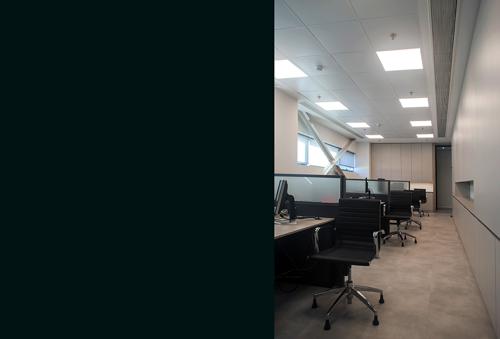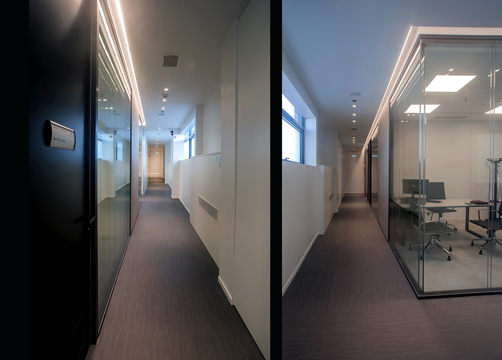 Όλοι οι γραφειακοί χώροι, οι οποίοι αναπτύσσονται εκατέρωθεν ενός κεντρικού διαδρόμου, έχουν μελετηθεί με σύγχρονα διαχωριστικά συστήματα γραφείων αποτελούμενα από κρύσταλλα καθ΄ όλο το ύψος και συμπαγή διαχωριστικά χωρίσματα έτσι ώστε να προσφέρουν από την μια πλευρά, άπλετο φωτισμό και διαφάνεια στους χώρους και από την άλλη, οπτική απομόνωση όπου απαιτείται.