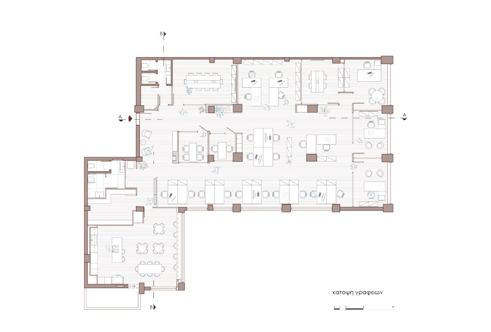 Αντικείμενο της μελέτης ήταν ο σχεδιασμός open plan χώρων με την δυνατότητα ευελιξίας στην διάταξη των γραφειακών ενοτήτων ανάλογα με τις ανάγκες της εταιρείας και η δημιουργία ενός ευχάριστου εργασιακού περιβάλλοντος που να αφομοιώνει με τον πιο δημιουργικό τρόπο όλο το στελεχιακό δυναμικό της.