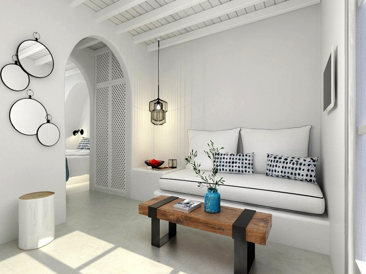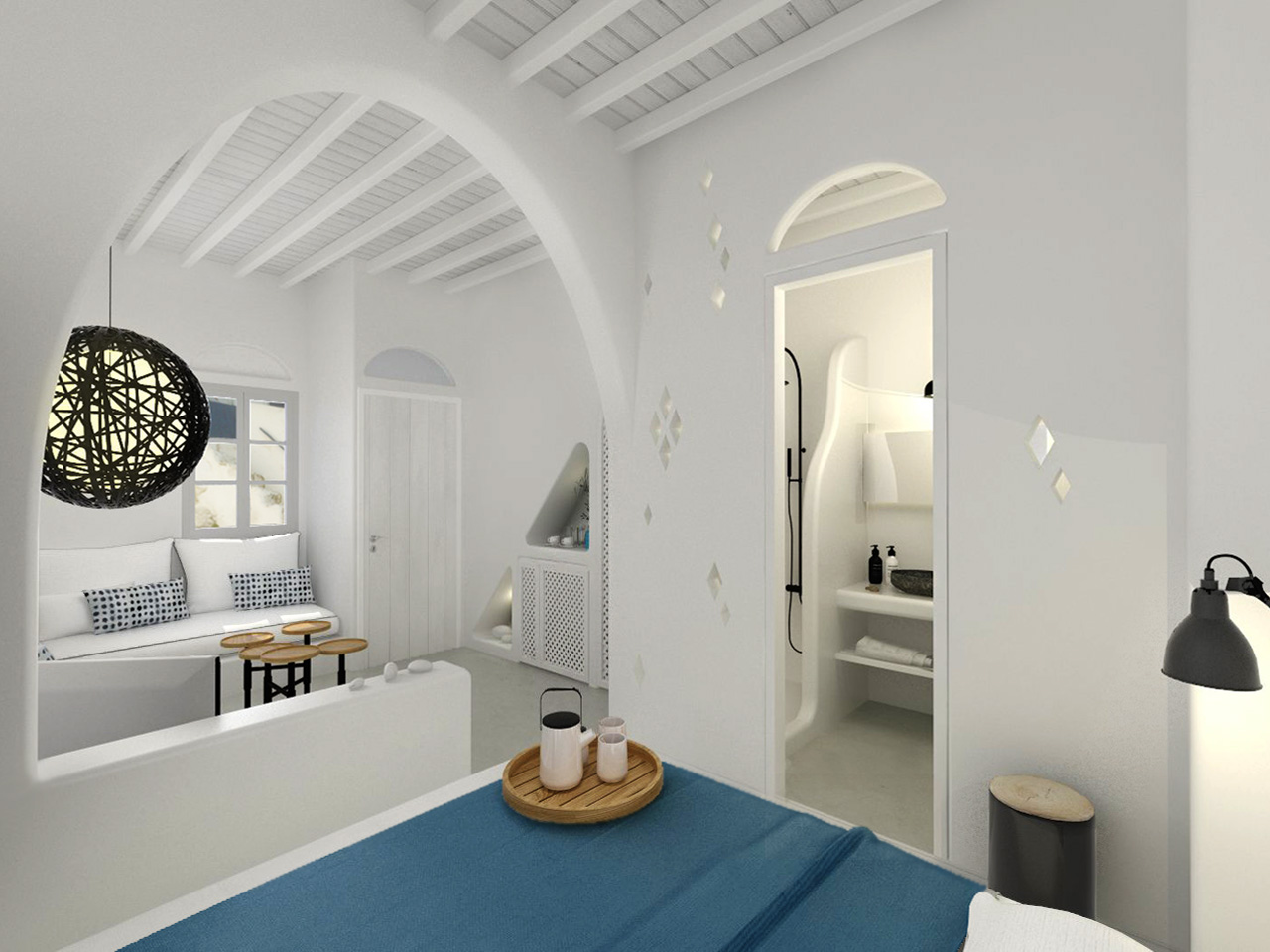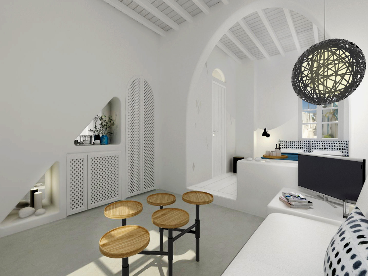 Κατά το σχεδιασμό, ιδιαίτερη έμφαση δόθηκε στην απλότητα των γραμμών, στα παραδοσιακά κυκλαδίτικα αρχιτεκτονικά στοιχεία και στην ενοποίηση των χώρων , λόγω της μικρής σχετικά επιφάνειας τους. Για το λόγο αυτό, διαμορφώθηκαν καμάρες ώστε να σηματοδοτούν το  πέρασμα από το καθιστικό στο δωμάτιο χωρίς όμως να δημιουργούν αυστηρά όρια μεταξύ τους. Η διαμόρφωση ενιαίων χώρων έδωσε επιπλέον την δυνατότητα  να εισέρχεται το φυσικό φως ανεμπόδιστα στο χώρο και να  αντανακλάται στις λευκές επιφάνειες των τοίχων  και των χτιστών επίπλων αναδεικνύοντας έτσι τη καθαρότητα και την απλότητα του σχεδιασμού.