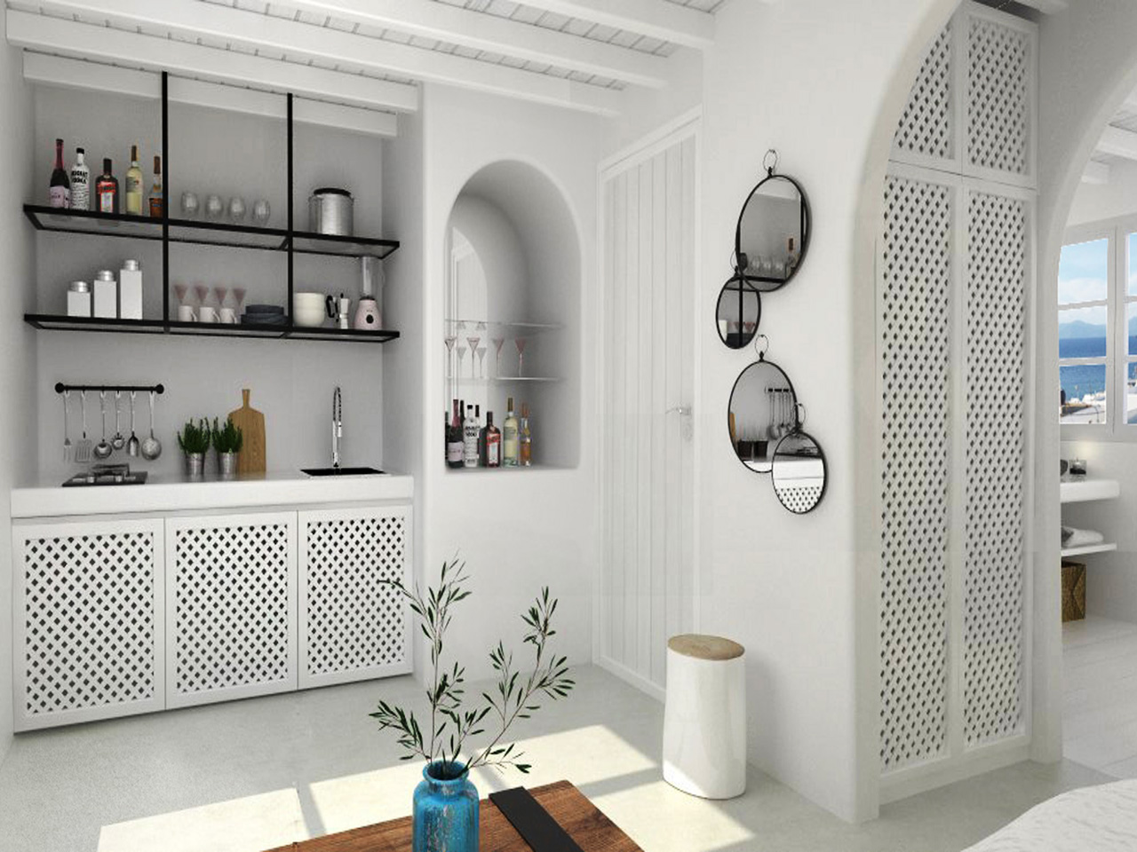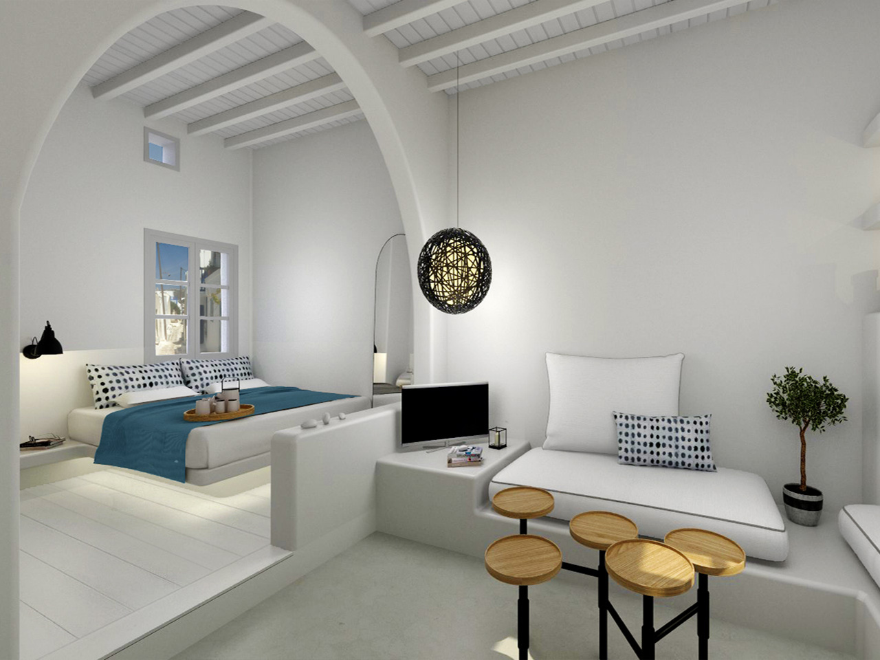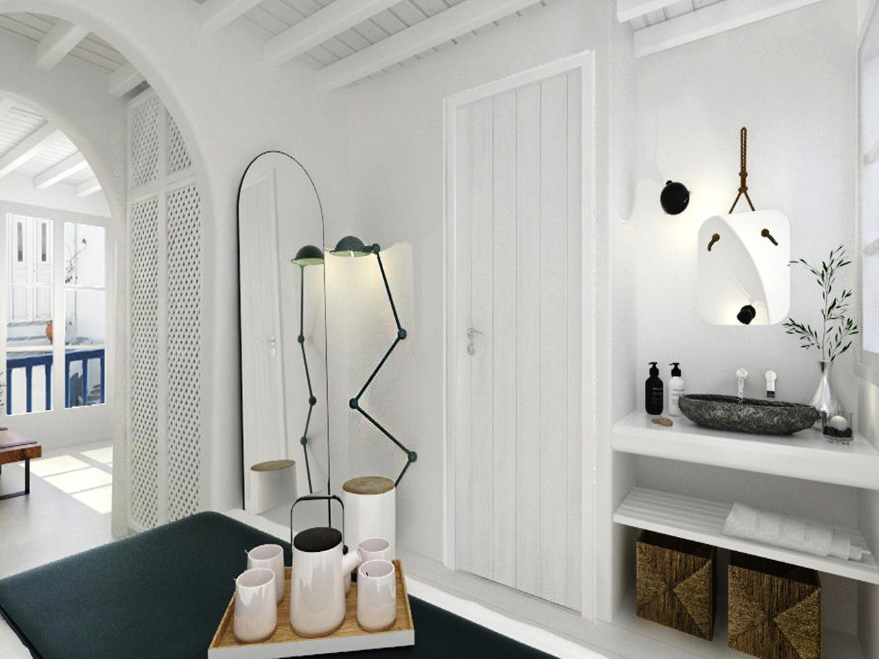 Κατά το σχεδιασμό, ιδιαίτερη έμφαση δόθηκε στην απλότητα των γραμμών, στα παραδοσιακά κυκλαδίτικα αρχιτεκτονικά στοιχεία και στην ενοποίηση των χώρων , λόγω της μικρής σχετικά επιφάνειας τους. Για το λόγο αυτό, διαμορφώθηκαν καμάρες ώστε να σηματοδοτούν το  πέρασμα από το καθιστικό στο δωμάτιο χωρίς όμως να δημιουργούν αυστηρά όρια μεταξύ τους. Η διαμόρφωση ενιαίων χώρων έδωσε επιπλέον την δυνατότητα  να εισέρχεται το φυσικό φως ανεμπόδιστα στο χώρο και να  αντανακλάται στις λευκές επιφάνειες των τοίχων  και των χτιστών επίπλων αναδεικνύοντας έτσι τη καθαρότητα και την απλότητα του σχεδιασμού.