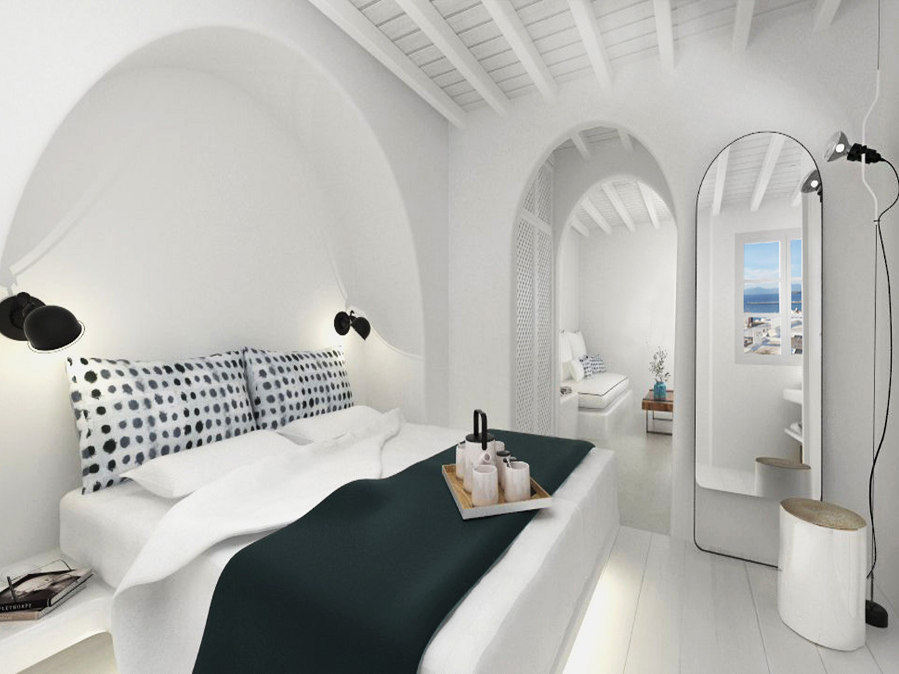 Στη περιοχή του Αγ. Σπυρίδωνα  της Μυκόνου,  κρυμμένη μέσα στα δαιδαλώδη κοσμοπολίτικα σοκάκια της  Χώρας, μια εγκαταλελειμμένη κατοικία, κτισμένη το 1987, ανακαινίστηκε πλήρως  και μετατράπηκε σε ένα τουριστικό κατάλυμα υψηλών προδιαγραφών και αισθητικής.