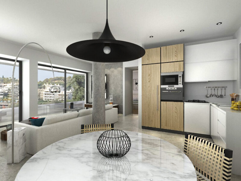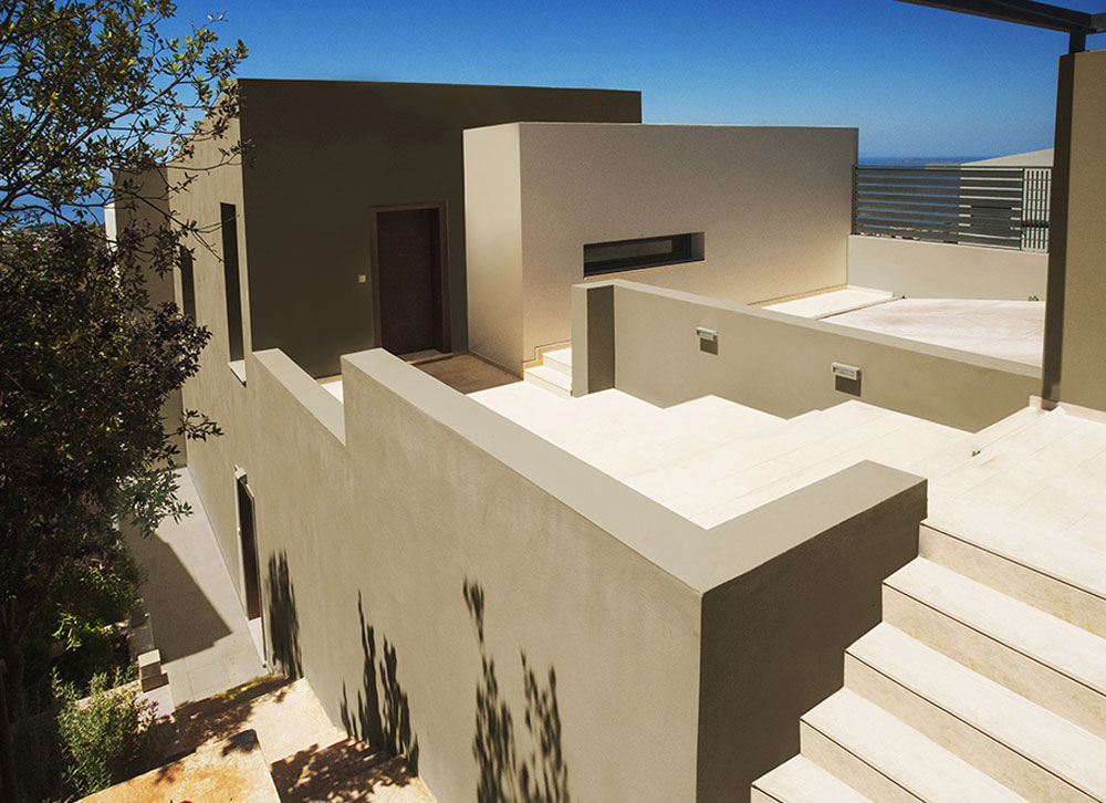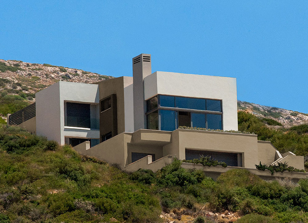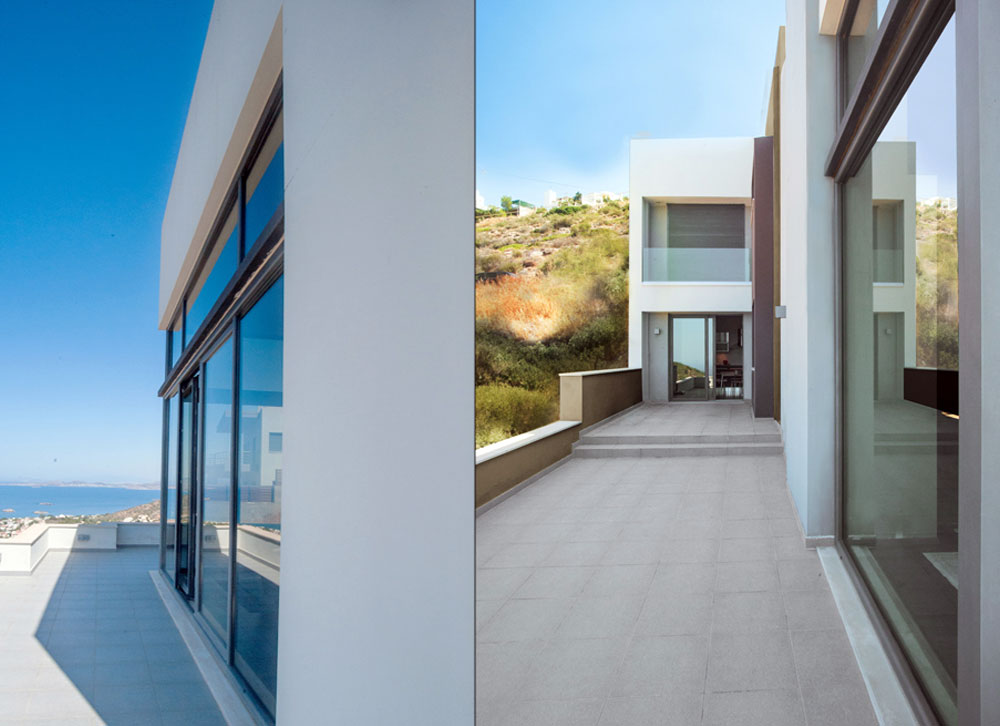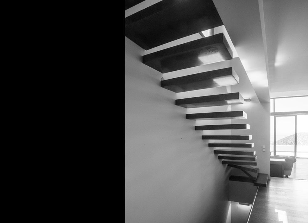 Τα Α΄και Β΄επίπεδα διαφοροποιούνται ογκοπλαστικά ενώ το ψηλοτάβανο καθιστικό με το τζάκι και τις μεγάλες τζαμαρίες επιτρέπει την απρόσκοπτη θέα προς την θάλασσα και από τα δύο επίπεδα.