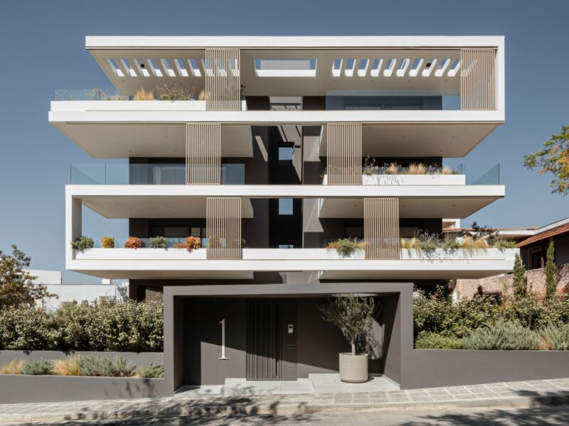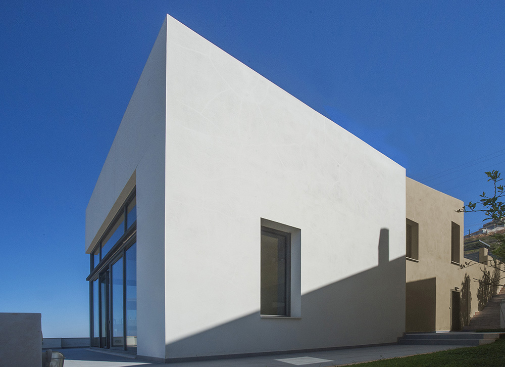 Η τριώροφη κατοικία 340τμ αναπτύσσεται σε τρία επίπεδα ακολουθώντας την έντονη κλίση του οικοπέδου, έτσι ώστε το σπίτι να εμφανίζεται στο επίπεδο του δρόμου πολύ μικρότερο από το μέγεθος του.